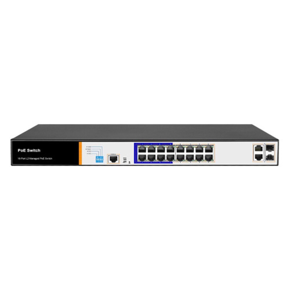 - 16 портов 10/100 Base RJ45 (PoE), 2 порта 10/100/1000 RJ45, 2 порта 10/100/1000 SFP