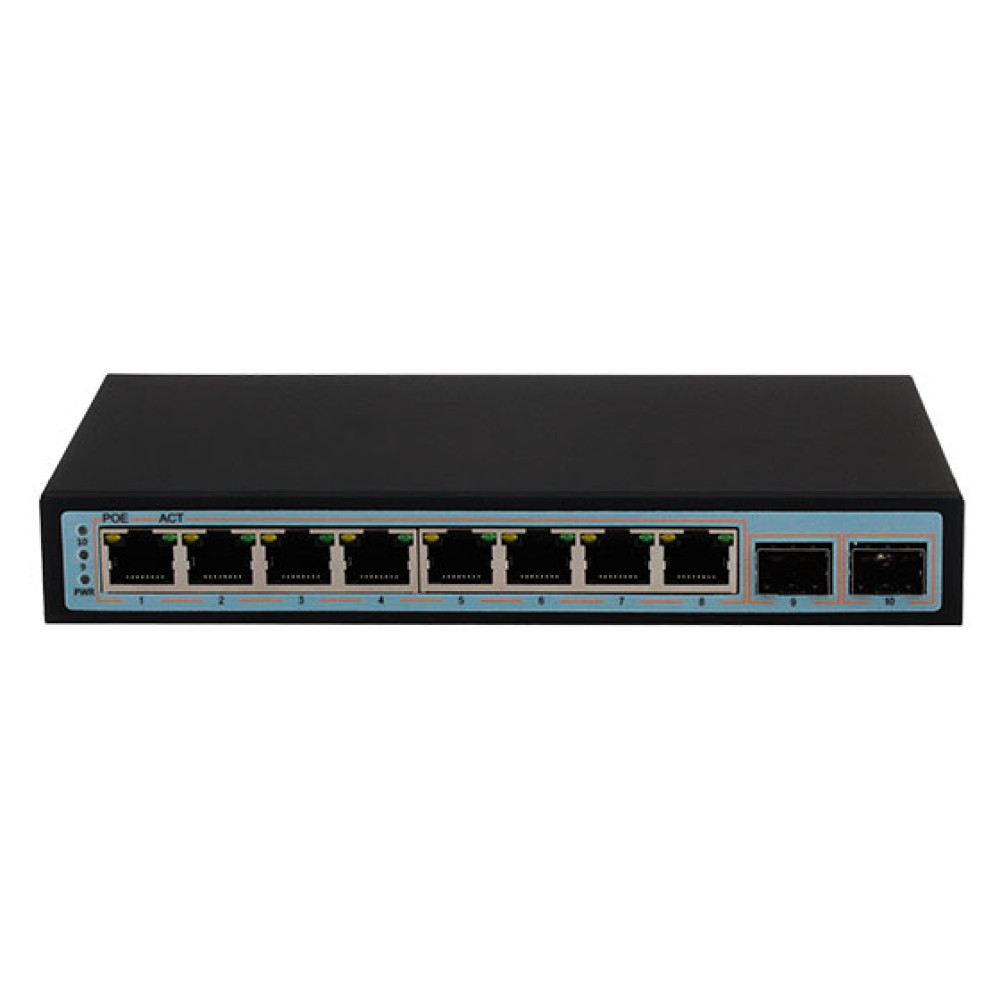 - 8 портов 10/100/1000Mbps PoE RJ45, 2 порта 10/100/1000Mbps SFP