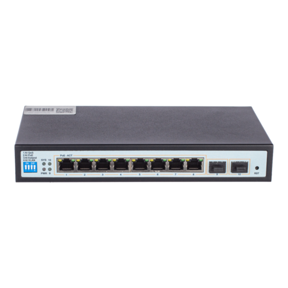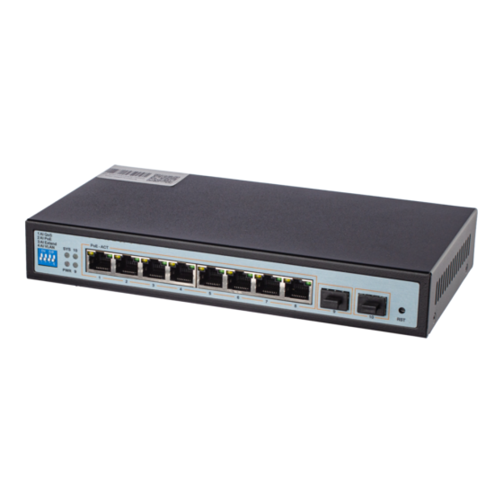 - 8 портов 10/100/1000 RJ45 (PoE), 2 порта 10/100/1000 SFP