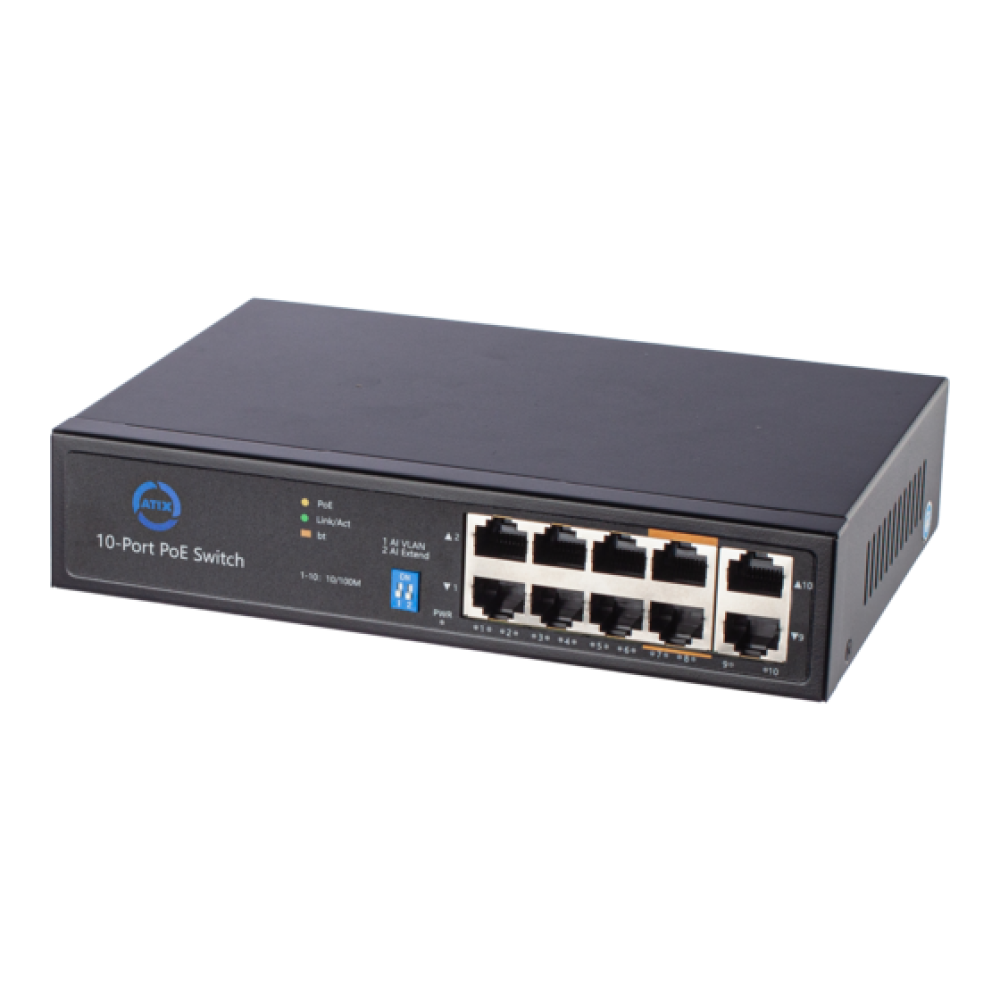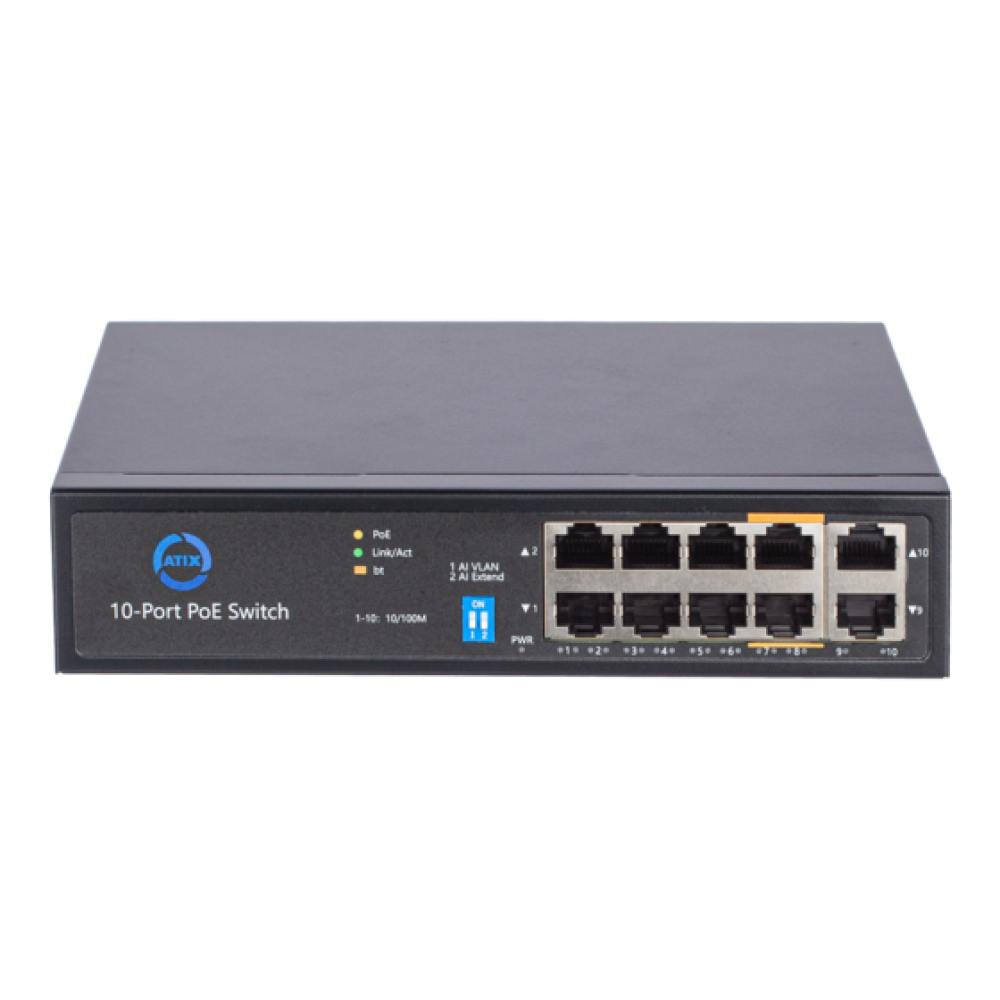 - 8 портов 10/100Base-TX (PoE+), 2 порта 10/100Base-TX