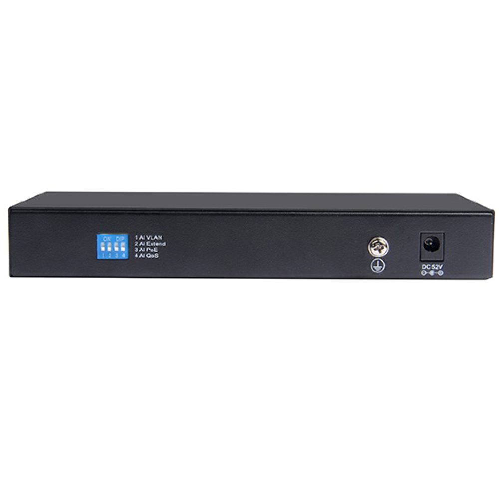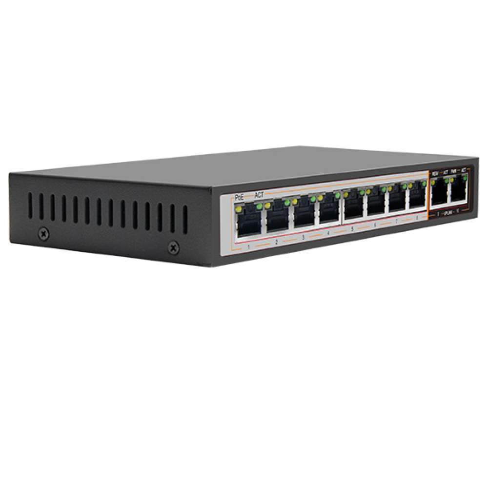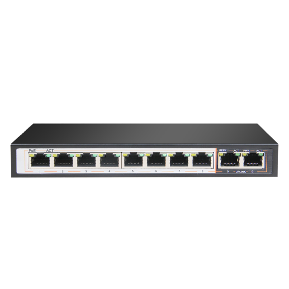 - 8 портов 10/100Mbps PoE RJ45, 2 порта 10/100/1000Mbps RJ45